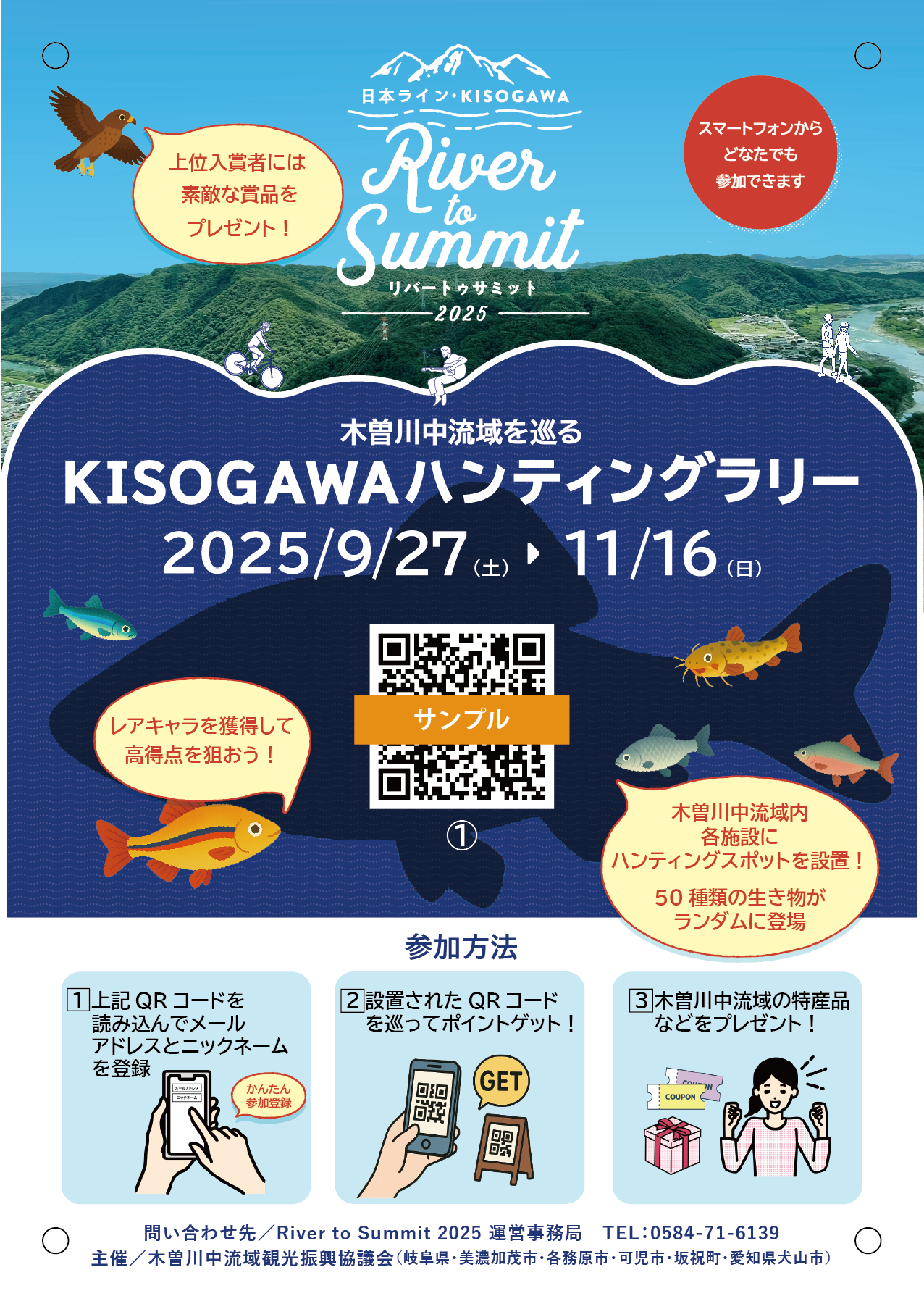 中流域の5つの市町(美濃加茂市、各務原市、可児市、坂祝町、犬山市)29か所に設置されたQRコードを読み込んで、ポイントと「KISOGAWAのいきもの図鑑」を作ろう!